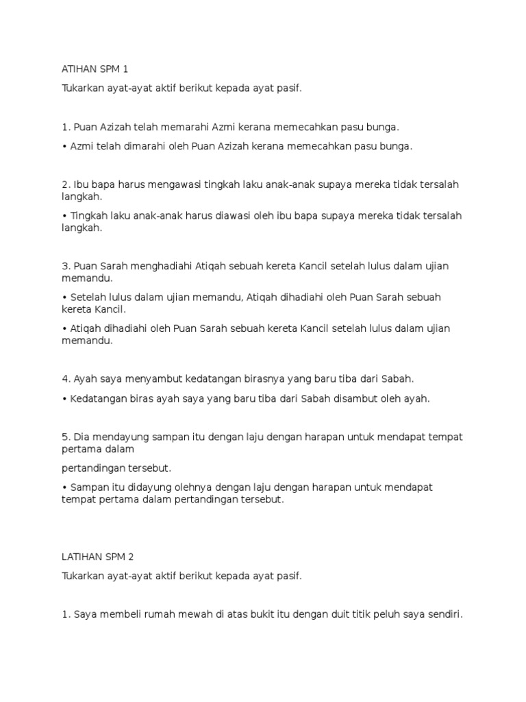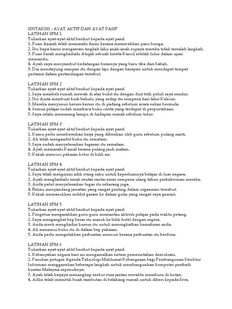 Ayat Aktif Dan Ayat Pasif Latihan Spm