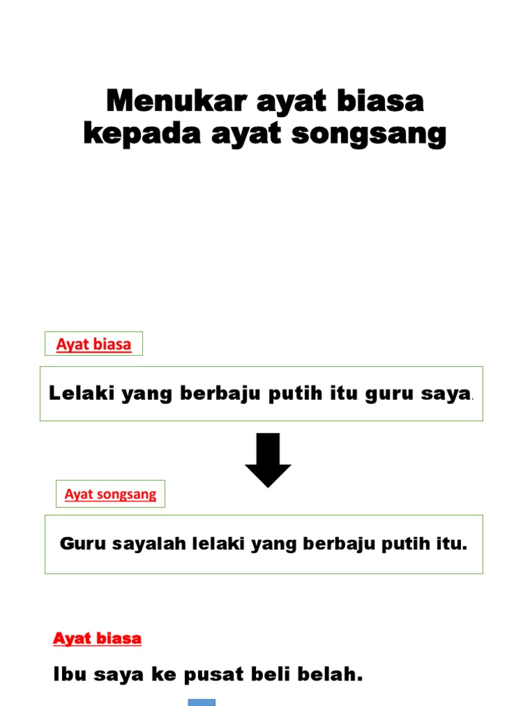 Ayat biasa kepada ayat songsang. Penyongsangan dapat dilakukan melalui proses pendepanan bertujuan memberikan penegasan kepada predikat. Susunan ayat songsang susunan biasa ayat dalam bahasa melayu ialah subjek predikat. Unsur unsur predikat dalam ayat ayat songsang dipindahkan ke hadapan mendahului subjek untuk memberikan penegasan kepadanya. Ayat tunggal mempunyai dua bentuk susunan iaitu.