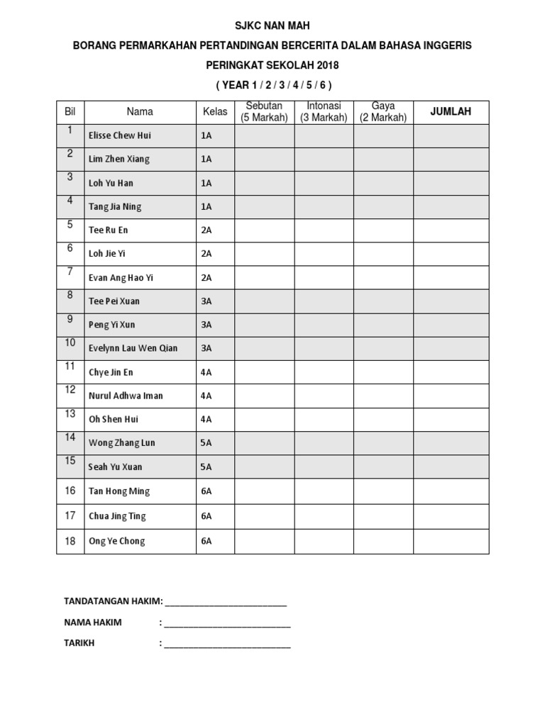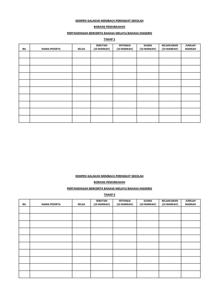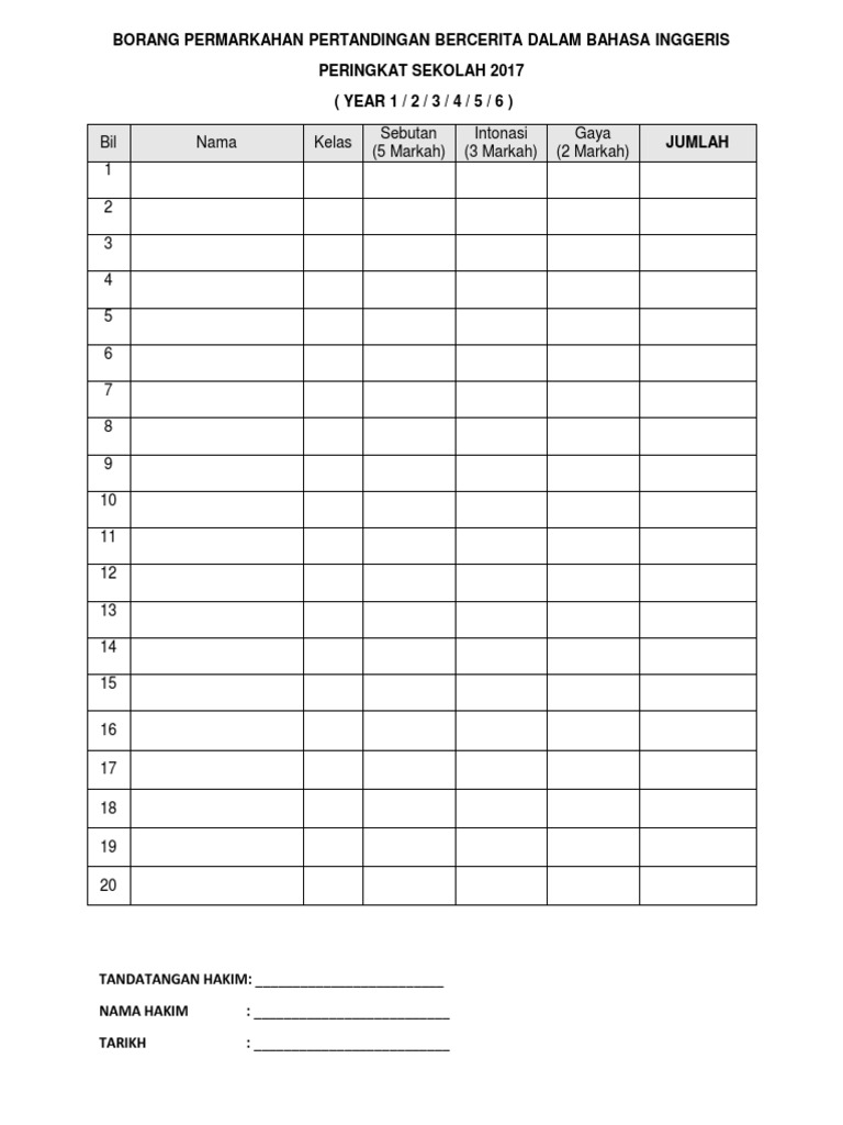 Kempen Galakan Membaca Peringkat Sekolah Borang Pemarkahan Pertandingan Bercerita Bahasa Melayu Bahasa Inggeris Tahap 1