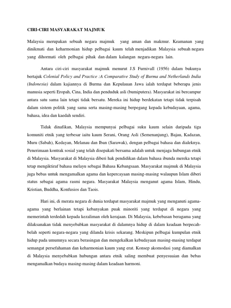 Ciri Ciri Masyarakat Majmuk Js Furnivall