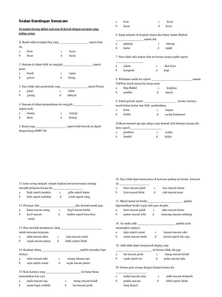 2 kuih yang ganjil bentuknya itu. 4 1 1 ii bercerita dengan menggunakan gaya bahasa yang indah dan santun bandingan semacam. Soalan bandingan semacam isi tempat kosong dalam ayat ayat di bawah dengan jawapan yang paling sesuai. Diakhir contoh pula ada latihan yang boleh dibuat untuk menguji pemahaman adik adik.
