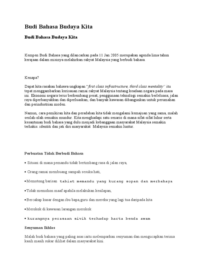 Kempen budi bahasa budaya kita. Kempen budi bahasa akan dilunturkan oleh pengaruh luar seperti pekerja asing ini. Kempen ini amat penting untuk melahirkan rakyat malaysia yang berbudi bahasa. Budi bahasa ialah norma kehidupan masyarakat malaysia yang terkenal dengan santun perkataannya dan indah pertuturannya. Kempen budi bahasa budaya kita relevan oleh datuk dr ismail ibrahim takdir allah swt menentukan berlaku beberapa peristiwa mungkar dan kejadian yang memperlihatkan kegagalan kita mematuhi hukum allah dan penyelewengan akhlak manusia mengakibatkan terserlah salah laku dan perlanggaran nilai murni akhlak islamiah dalam kalangan masyarakat kita.