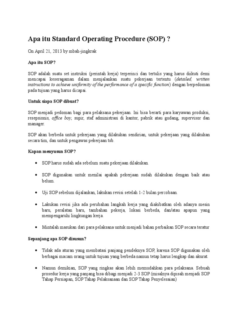 Lakukan brainstorming dengan jawatankuasa mengenai proses dan prosedur yang telah ditulis. Standard operating procedure sop adalah dokumen yang berkaitan dengan prosedur yang dilakukan secara kronologis untuk menyelesaikan suatu pekerjaan yang bertujuan untuk memperoleh hasil kerja yang paling efektif dari para pekerja dengan biaya yang serendah rendahnya. Perlu dicatat bahwa sop harus mengalami evaluasi minimal enam bulan sekali untuk mengetahui tingkat efisiensi sop tersebut. Pengertian sop menurut para ahli.