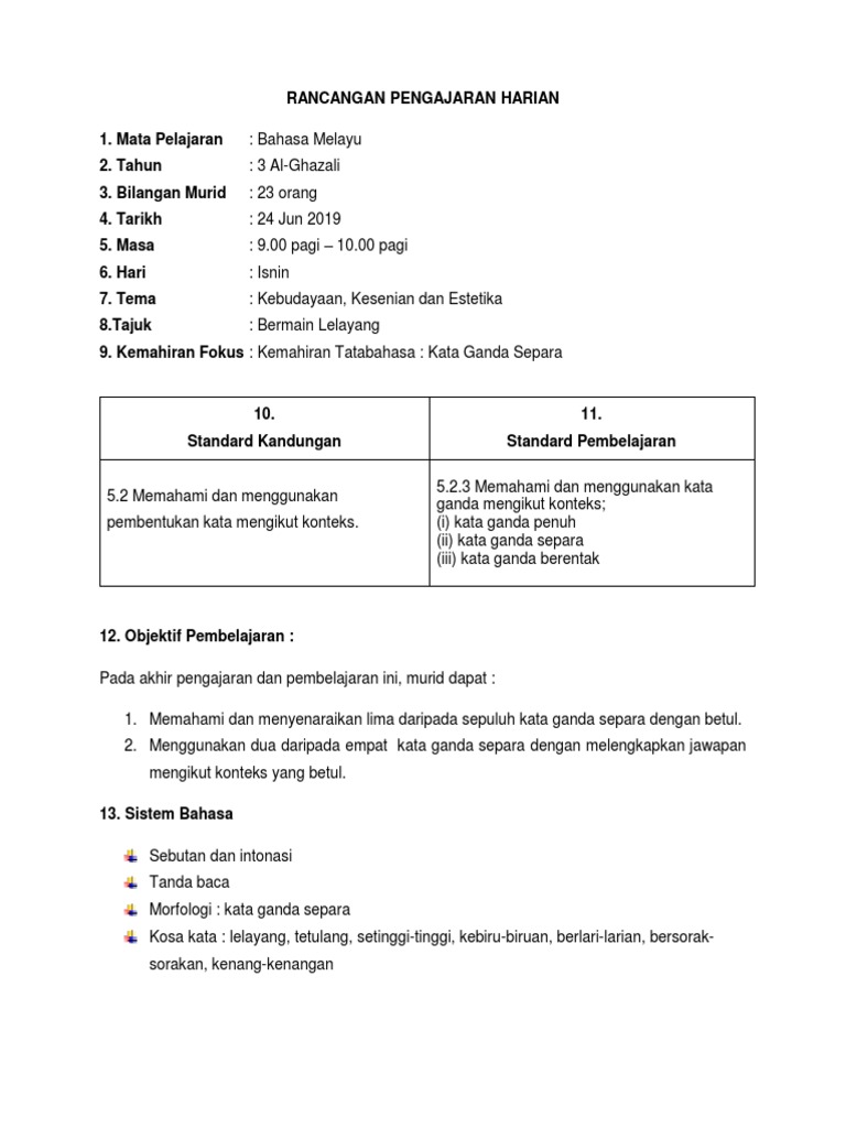 Rph kata ganda tahun 1. Rph bahasa melayu tahun 1 adalah rancangan pengajaran harian yang perlu disediakan lebih awal oleh guru sebelum menjalankan sesi pegajaran dan pembelajaran rancangan pengajaran harian ini dibina sebagai panduan para guru untuk mengajar dengan lebih sistematik dan efektif serta mampu untuk mencapai apa yang diobjektifkan dalam sesi pengajaran dan pembelajaran kelak. Latihan kata ganda penuh tahun 3. Rancangan pengajaran harian bm tahun 1. Bagi murid murid yang lemah saya arahkan mereka untuk menggarisi kata seru yang terdapat dalam edaran lembaran kerja yang diberikan.