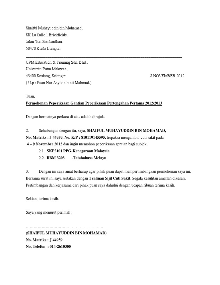 Surat Rasmi Tidak Hadir Ke Sekolah Atas Urusan Keluarga Dan Sebagainya
