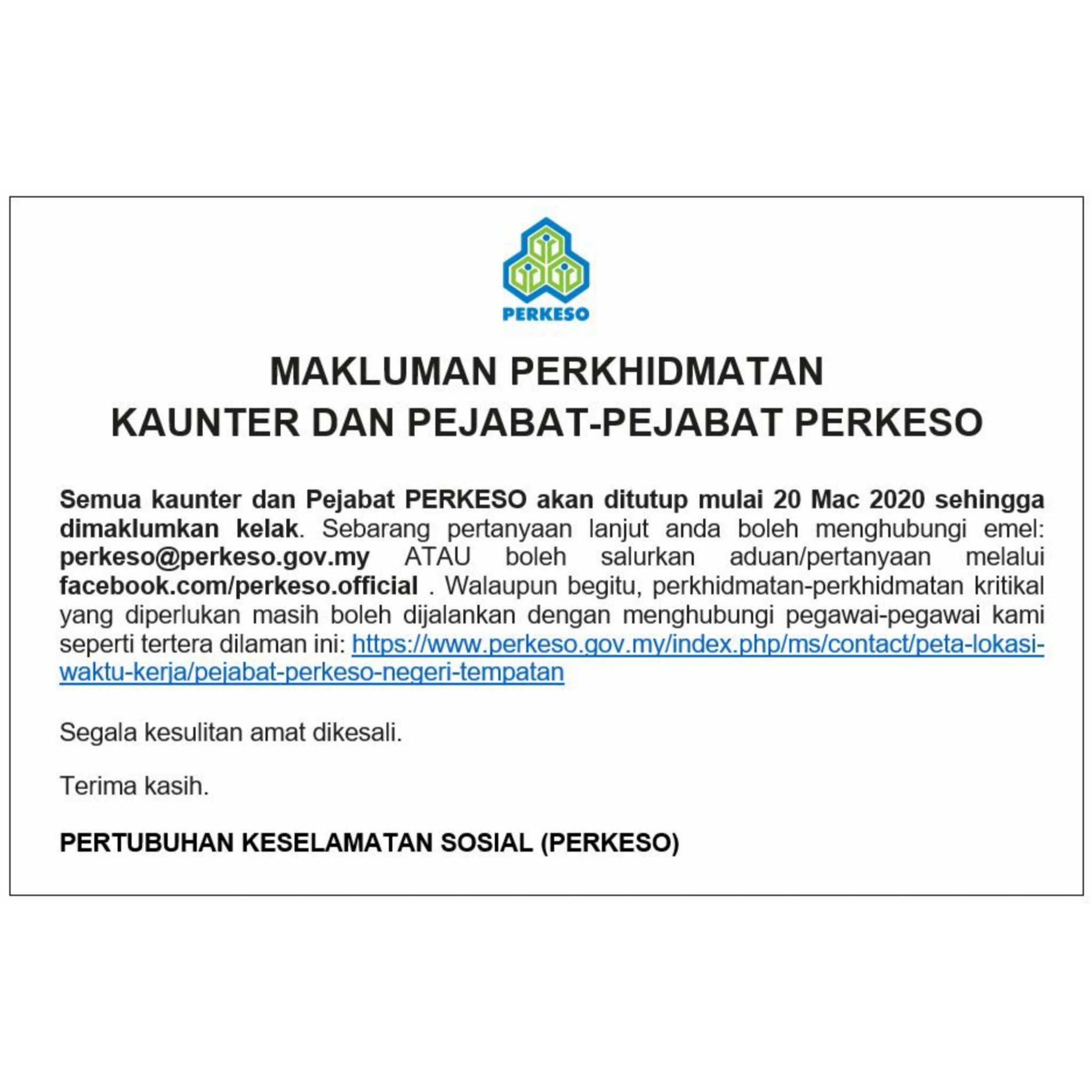 Perkeso Socso On Twitter Makluman Perkhidmatan Kaunter Dan Pejabat Pejabat Perkeso Bagi Perkhidmatan Perkhidmatan Kritikal Yang Diperlukan Masih Boleh Dijalankan Dengan Menghubungi Pegawai Pegawai Kami Seperti Tertera Dilaman Ini Https T Co